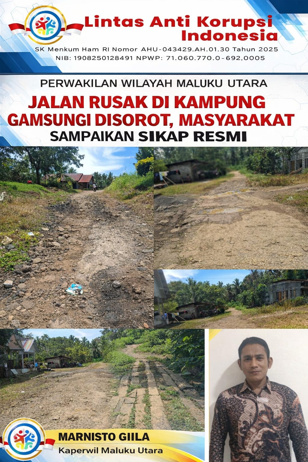 Tobelo Barat, Halmahera Utara Lintasantikorupsiindonesia.com  — Kondisi jalan di Kampung Gamsungi kini menjadi perhatian publik setelah masyarakat menyampaikan pernyataan sikap atas kerusakan akses utama desa yang dinilai telah berlangsung cukup lama tanpa penanganan signifikan.Jumat 19/02/2026