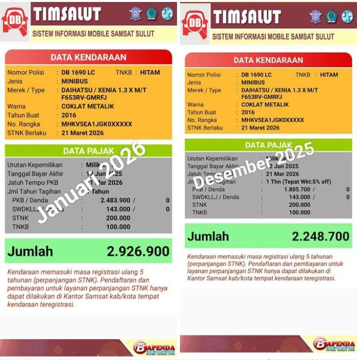 Manado, Lintasantikorupsiindonesia.com Kenaikan pajak yang dialami sejumlah warga Sulawesi Utara pada tahun 2026 menjadi perhatian publik setelah ramai diperbincangkan di media sosial Berdasarkan unggahan warga nominal pajak yang pada tahun 2025 tercatat sebesar Rp2.248.700 meningkat menjadi Rp2.926.900 pada 2026 atau naik sekitar Rp678.200 dalam satu tahun setara hampir 30% Senin(05/01/2026).