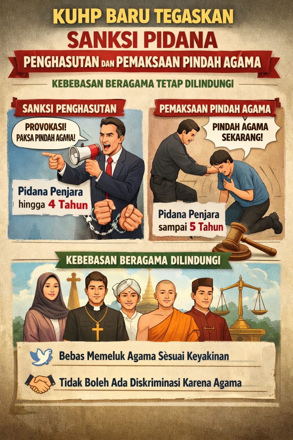 Minahasa utara, Lintasantikorupsiindonesia.com — Kitab Undang-Undang Hukum Pidana (KUHP) baru secara tegas mengatur sanksi pidana terhadap perbuatan penghasutan dan pemaksaan seseorang untuk meninggalkan atau berpindah agama.