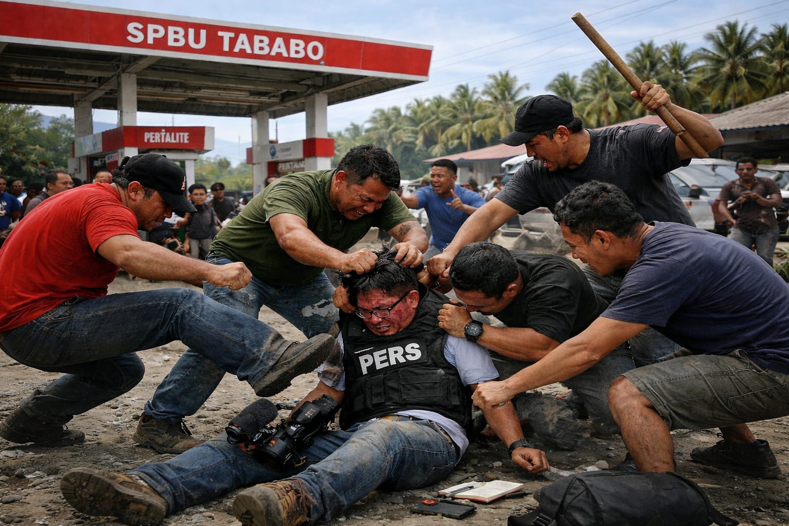 Minahasa Tenggara, lintasantikorupsiindonesia.com — Upaya sejumlah wartawan memantau dugaan aktivitas penyelewengan BBM bersubsidi di SPBU Tababo, Kecamatan Belang, Kabupaten Minahasa Tenggara (Mitra) berujung aksi kekerasan. Seorang jurnalis dilaporkan mengalami luka luka setelah diduga dianiaya secara brutal oleh sekelompok orang yang diduga merupakan kaki tangan oknum mafia solar di lokasi tersebut.