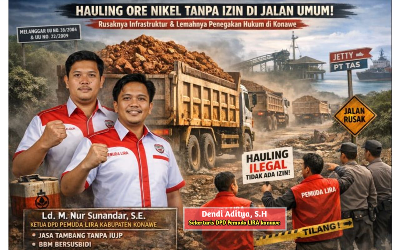 KONAWE, LINTASANTIKORUPSIINDONESIA.COM —DPD Pemuda LIRA Kabupaten Konawe menyoroti aktivitas pengangkutan ore nikel (Hauling) yang dilakukan oleh PT ST Nickel Resources yang melintasi ruas jalan Kabupaten Konawe, Kota Kendari, Provinsi Sulawesi Tenggara, hingga menggunakan jalan nasional menuju Jetty PT Tiara Abadi Sentosa (PT.TAS) di Kecamatan Nambo, Kota Kendari. Aktivitas tersebut diduga kuat dilakukan tanpa izin penggunaan jalan yang sah dan lengkap dari instansi berwenang.