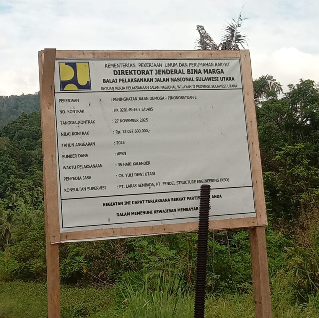Sulawesi Utara, Lintasantikorupsiindonesia.com– Proyek peningkatan jalan nasional di Sulawesi Utara yang didanai APBN senilai Rp13 miliar lebih kini terbengkalai. Paket pekerjaan ruas Dumoga-Pinonobatuan 2 yang dikerjakan oleh CV Yuli Dewi Utari hanya terealisasi sekitar 30%, padahal masa kontrak 35 hari kalender telah berakhir.