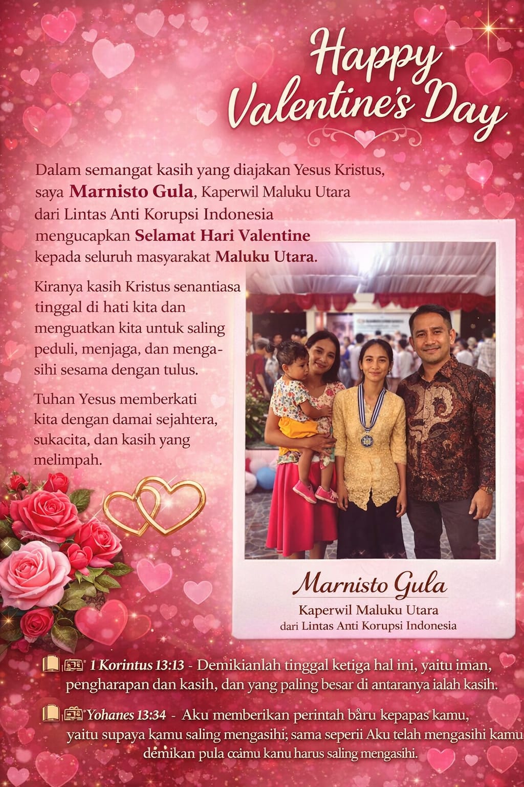 Melalui momentum Valentine, Marnisto Gula, Kaperwil Maluku Utara dari Lintas Anti Korupsi Indonesia, menyampaikan pesan penuh makna yang berakar pada nilai-nilai Kristiani: kasih yang tulus, kepedulian terhadap sesama, serta komitmen menjaga damai dalam kehidupan bersama.