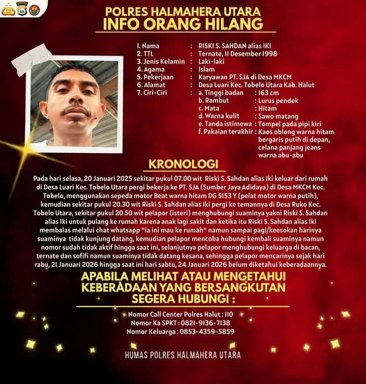 HALUT, Lintasantikorupsiindonesia.com – Seorang warga Desa Luari, Kecamatan Tobelo Utara, Kabupaten Halmahera Utara, bernama Riski S. Sahdan alias Iki, dilaporkan hilang sejak Selasa, 20 Januari 2025 hingga saat ini belum diketahui keberadaannya. Pihak keluarga bersama aparat kepolisian terus melakukan upaya pencarian dan meminta bantuan masyarakat luas.