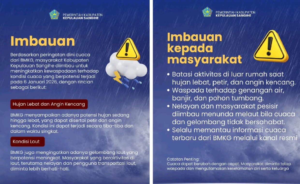 Sangihe, Lintasantikorupsiindonesia.com – Pemerintah Kabupaten (Pemkab) Kepulauan Sangihe mengeluarkan peringatan dini dan imbauan kepada seluruh lapisan masyarakat untuk meningkatkan kewaspadaan menghadapi potensi cuaca ekstrem yang diprediksi terjadi pada Selasa, (06/01/2026)